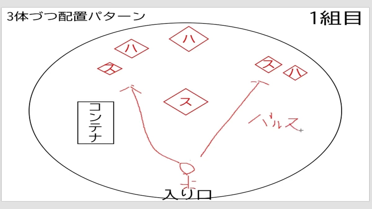 立ち位置は入り口の真向かいがおすすめです(コンテナ裏で攻略する方もいます)。5組目の時にコンテナ裏にいる状態で敵を倒しておきます。